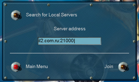 To connect to a server, you need to go from the main menu in section "Multiplay", select "Join Server", in the text field "Server address" write il2.com.ru:21000 (for version 4.09m) or il2.com.ru:21001 (for version 4.14.1m) and click "Join".