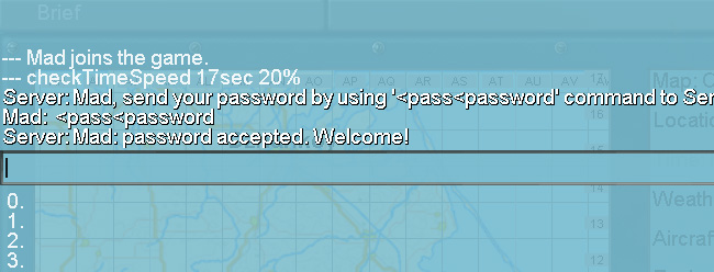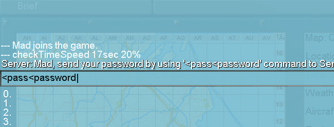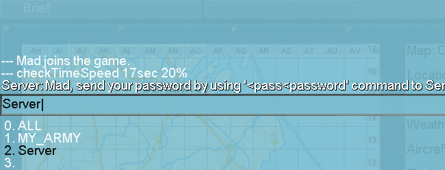 A window appears in which you select who will be sent. Use the arrow keys to create rows below ALL (send to all) and MY_ARMY (send to my army) item Server. Password should be sent to Server, that the password is not seen by other players. Then press Enter.
